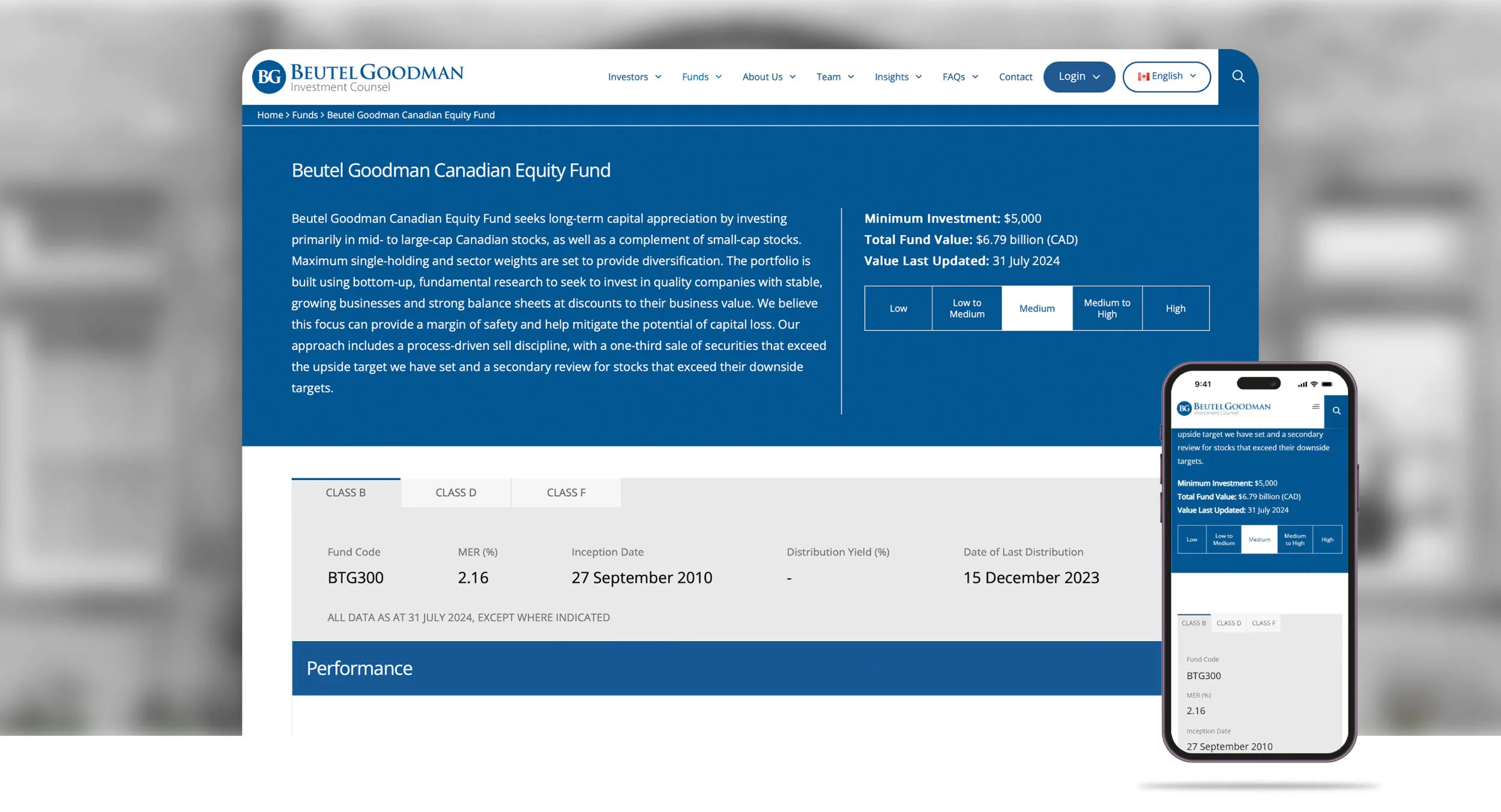 Beutel Goodman needed a website that could appeal to a diverse audience, including addressing the sensibilities of the Canadian indigenous population, and communicating effectively in both English and French. Additionally, the site had to showcase dynamic data across their many funds clearly and accurately.