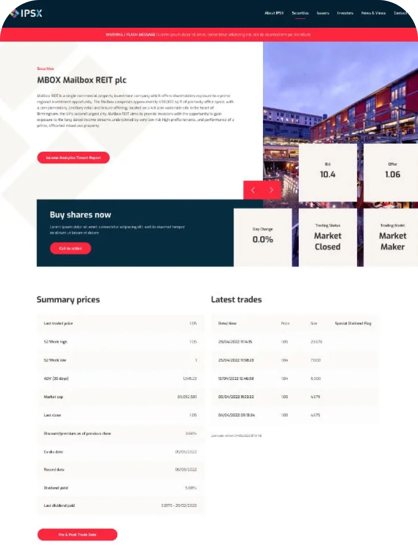 IPSX needed a public facing website to both explain and promote their business as well as display market data from the securities listed on the exchange. The latter requirement was critical as IPSX is strictly regulated by the Financial Conduct Authority (FCA). It is a mandatory requirement for an exchange to make trading and financial data on the instruments traded on it available to investors, so developing a robust solution to meet this requirement was paramount to the success of their business. The brief was made even more complex due to additional datasets, such as information relating to the properties (the “underlying assets”) that were being listed, needing to be displayed alongside the market data. Think USA Stock Exchange + Zoopla!